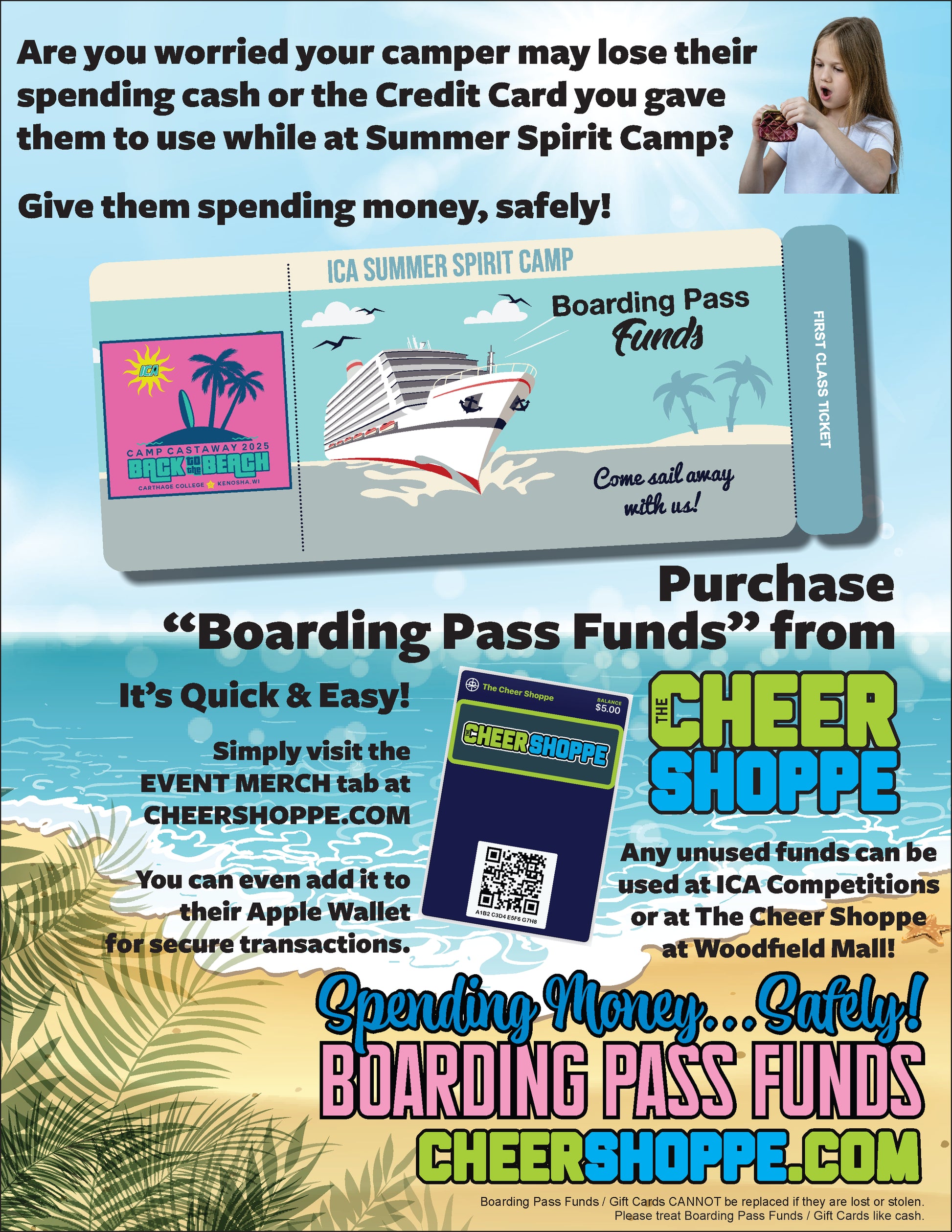 Give your athlete spending money without sending them with actual money or a credit card. Give them spending money safely with Camp Castaway Boarding Pass Funds. This gift card/QR code can be loaded directly to their phone. See the instruction sheet on how to load. If they don't have a phone, they will need the QR code to make purchases at The Cheer Shoppe or at the Cheer Shoppe Cafe while they are at camp. If they have money left over, that's ok! You can use these funds during the season at ICA competitions or even use it at The Cheer Shoppe in Woodfield Mall. Please note that we cannot replace lost or stolen QR codes. Please treat boarding pass funds/gift cards just like cash.